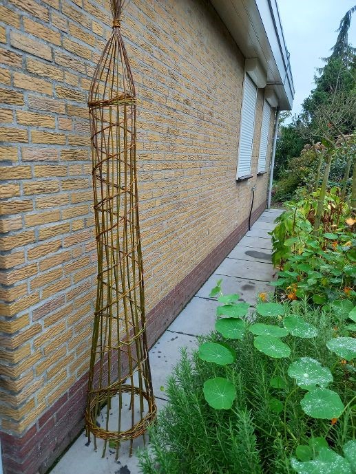 We maken natuurlijk al plannen voor het komende tuinseizoen. Misschien wil je wel lathyrus zaaien, of heb je een clematis waar een natuurlijke steun van pas zou komen. Daarom gaan we een plantensteun vlechten van wilgentenen. Je kunt ‘m zo hoog maken als je zelf wilt. Er kunnen ook pindaslingers of ander vogelvoer in gehangen worden.